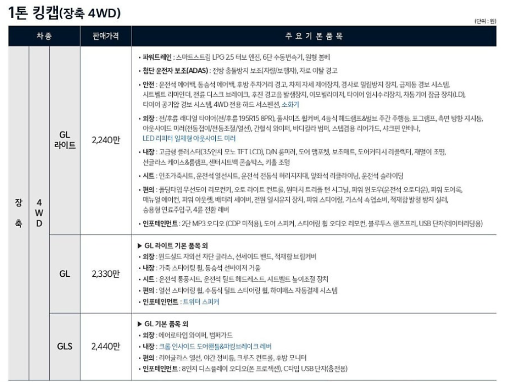 봉고 트럭은 초장축 더블캡과 킹캡 형태, 그리고 자동(A/T) 및 수동(M/T) 변속기 선택, 내비게이션, 평바닥적재함, 하드서스펜션 등 다양한 옵션을 제공하여 김이사님 사업에 최적화된 구성을 선택할 수 있도록 지원합니다. (예: 초장축 킹캡 LPi 25각자 2WD M/T L 기본형 평바닥적재함 21,330,000원, A/T GLS 플러스 평바닥적재함, 내비게이션 25,300,000원)