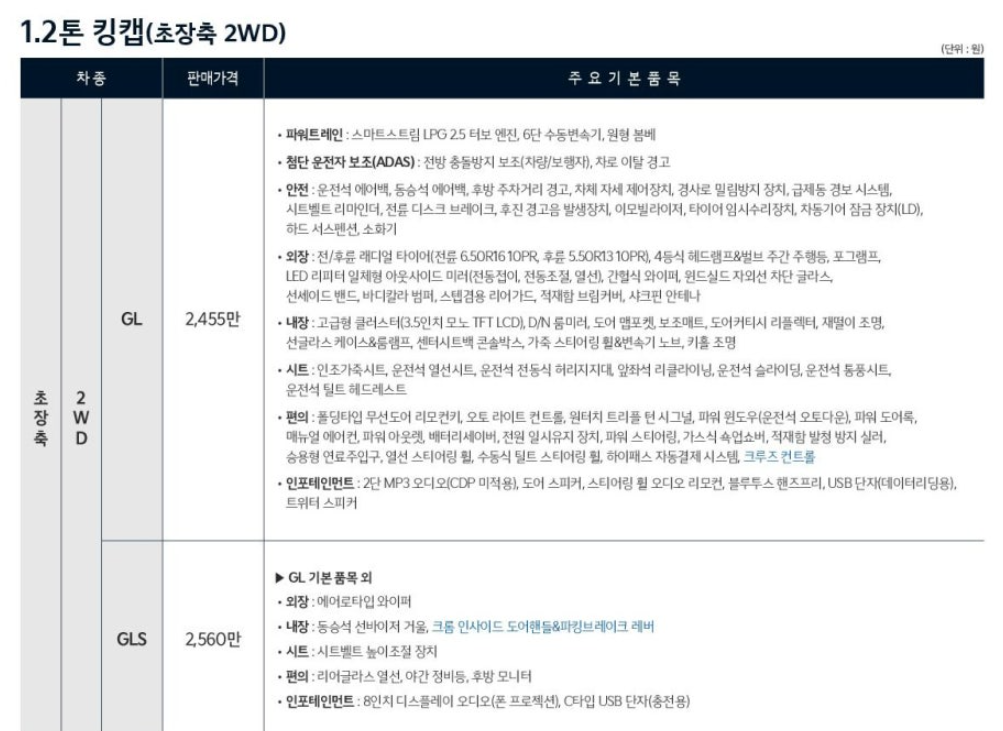 - 추천 용도: 도심 내 소량 화물 운송, 물류 기업의 친환경 이미지 구축, 친환경 정책에 발맞추는 기업들에게 이상적인 선택입니다. (예: 초장축 킹캡 2WD A/T GL 기본형 44,500,000원)